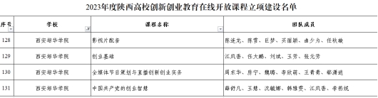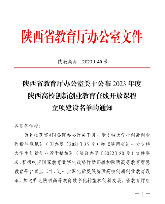 近日,陕西省教育厅发布了《关于公布2023年度陕西高校创新创业教育在线开放课程立项建设名单的通知》,我校陈连龙、江凤香、周东华、薛舒凡四位教师申报的课程通过了立项建设申请。