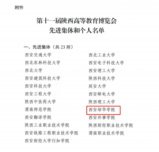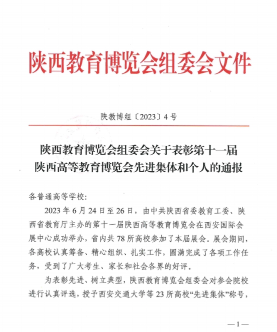 近日,陕西教育博览会组委会发布了《关于表彰第十一届陕西高等教育博览会先进集体和个人的通报》,经过认真评选,决定授予388vip太阳集团等23所高校“先进集体”称号。