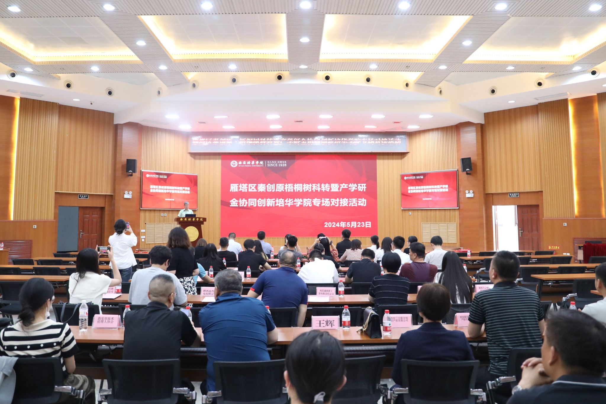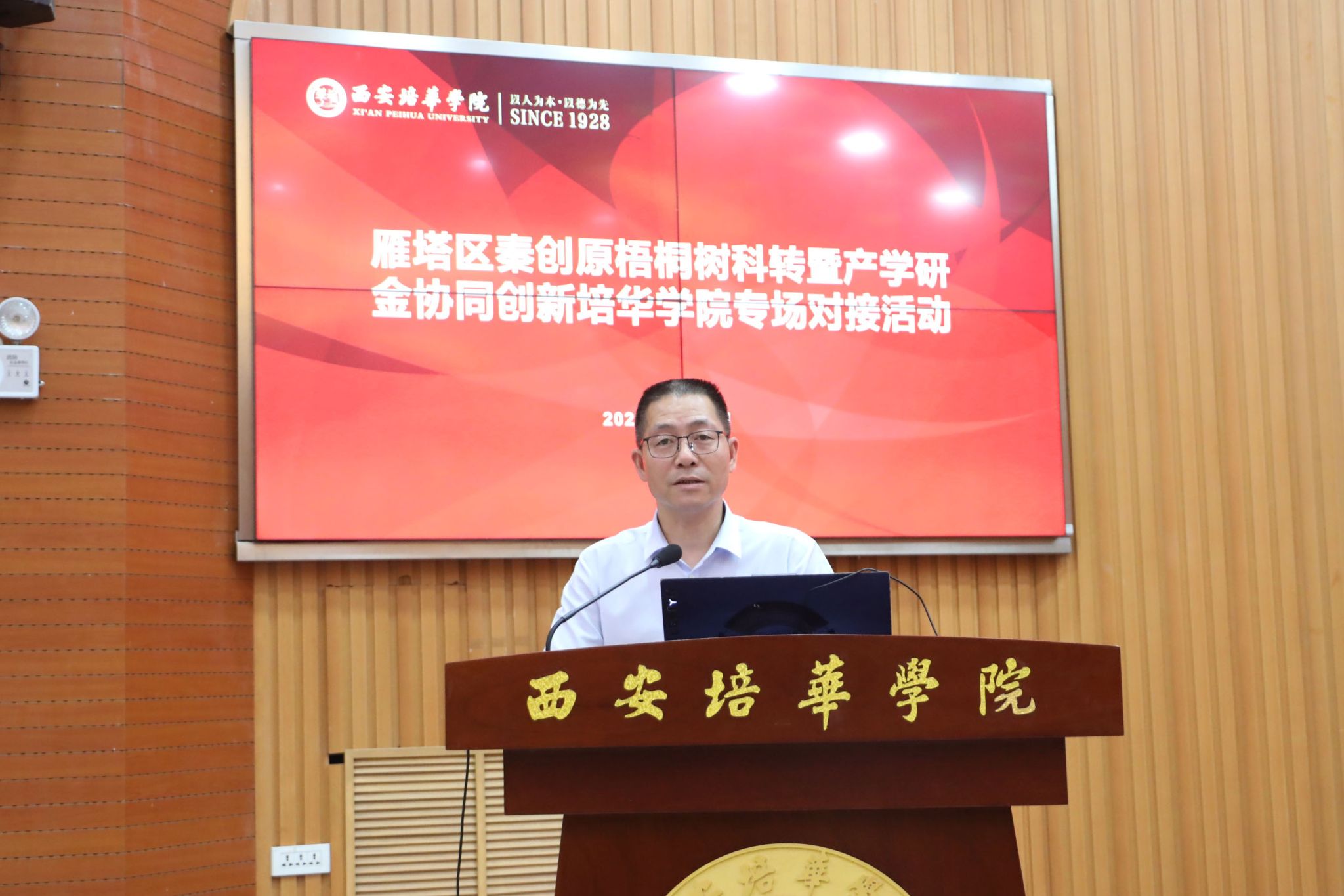 为更好搭建雁塔区产学研合作及人才交流平台,促进高校科技成果就地转化,有力推进雁塔区梧桐树科转提质增效,5月23日下午,“秦创原雁塔区梧桐树科转暨产学研金协同创新系列活动培华学院专场”校企专题对接会在明德楼报告厅举行。此次活动由市科技局指导,雁塔区科工局、388vip太阳集团联合主办,陕西葵垦网络科技有限公司、西安三立联合知识产权有限公司协办。雁塔区委人才办、区市场监管局、区行政审批局、区金融办及相关园区和街办、西安财经大学、建设银行西安小寨支行、陕西赛微高科技有限公司等15家科技企业代表参加了此次活动。