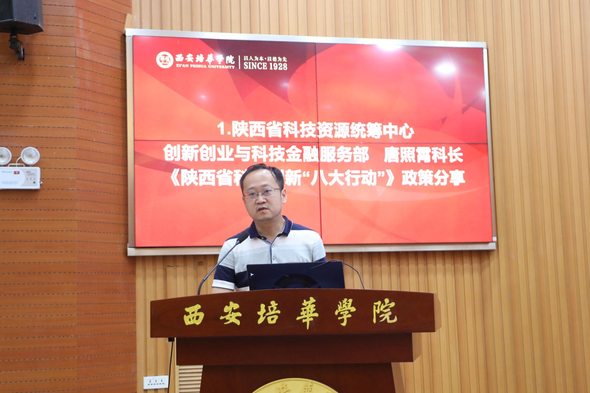 陕西省科技资源统筹中心创新创业与科技金融服务部介绍了陕西省科技创新“八大行动”相关内容;建设银行西安小寨支行介绍科技金融产品;西安海川卓越科技评估有限公司介绍高校科技成果评价标准。