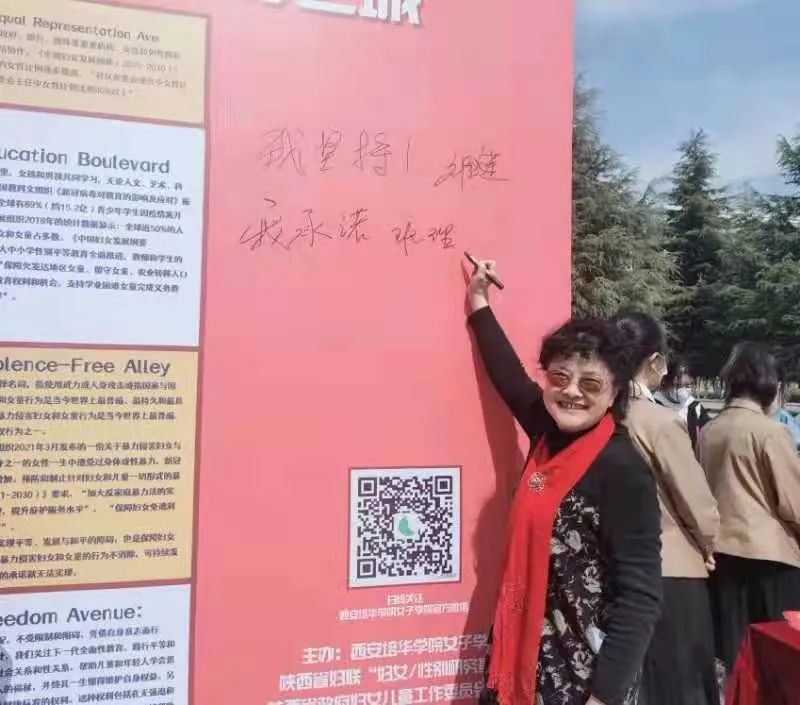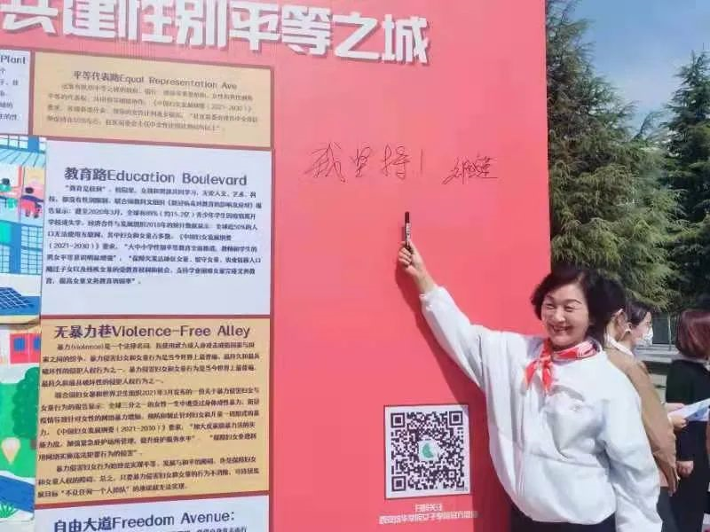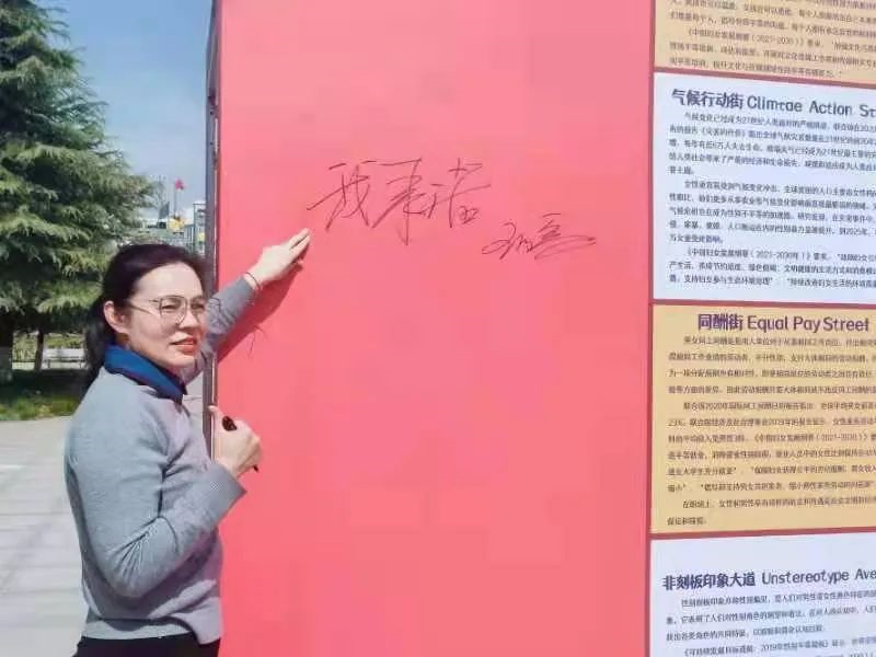 最后,参与者在轻松愉快的氛围中,手持各色“自尊”“自信”“自立”“自强”,“构建美好世界”“表现你自己”“今天你最美”的异形板进行合影留念,并在背景板上写下“我坚持”“我承诺”“我行动”的口号和自己的姓名,昭示本校师生推进性别平等决心和行动。