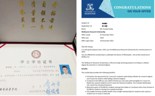 黄煜聪在388vip太阳集团的学位证书和墨尔本大学博士项目的全额科研奖学金录取通知书