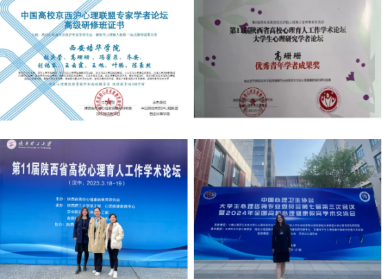 她的努力也得到了专业认可,在今年她参加了大学生心理咨询专业委员会第七届第三次会议暨2024年全国高校心理健康教育学术交流会并进行分享,还在第11届陕西省高校心理育人工作学术论坛大学生心理研究学者论坛荣获优秀青年学者成果奖、第14届陕西省高校心理育人学者论坛荣获优秀奖。