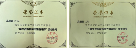“职业生涯体验月优秀指导老师”“一站式学生社区建设中优秀德育导师”“辅导员素质大赛优秀奖”“就业指导节优秀工作者”......每一份荣耀,皆是对高珊珊老师不懈努力的最佳诠释。在她与学子们的携手并进中,共谱学风建设的新篇章。