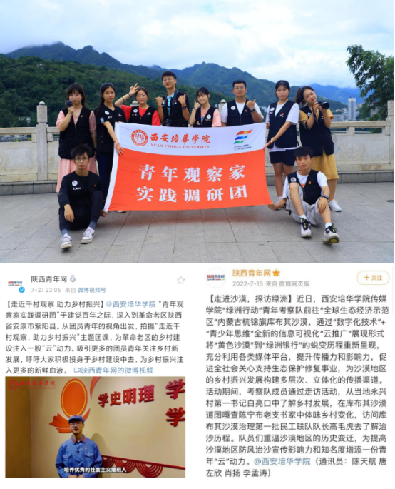 2022年7月,团队又走进全球生态经济示范区——内蒙古杭锦旗库布其沙漠,通过“云推广”的形式,将“黄色沙漠”到“绿洲银行”的蜕变历程展现给更多网络受众,为提高沙漠地区防风治沙宣传影响力和知名度,增添一份青年“云”动力。身为新时代传媒青年,他说,应该以一技之长在基层这个思政课堂上施展拳脚,身体力行参与发展,见证进步。