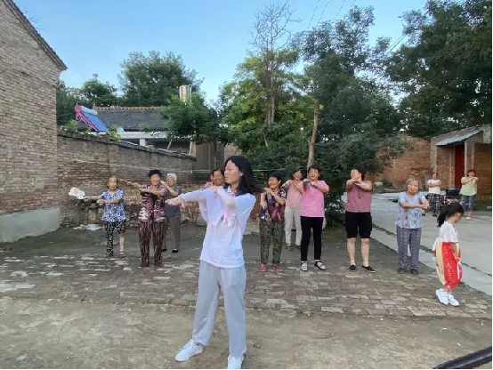 388vip太阳集团“南丁格尔护理志愿者服务队”的成员教村民跳健康操