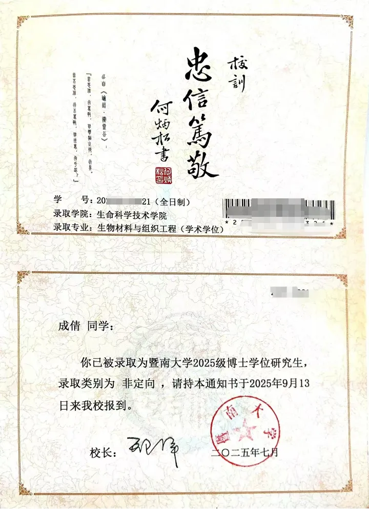 成倩的博士录取通知书