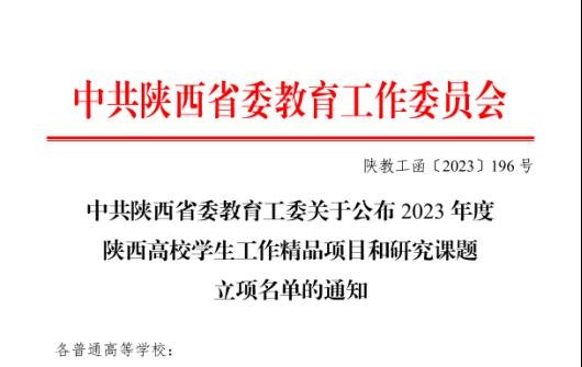 9月5日,中共陕西省委教育工委发布了《关于公布2023年度陕西高校学生工作精品项目和研究课题立项名单的通知》,学校党委学工部副部长权勇太主持的《以姜维之班创建提升立德树人育人成效的实践与探索》获精品项目立项;学生潜能发展中心叶腾老师主持的《“屏媒时代”大学生短视频成瘾现状及教育管理对策分析》获学生工作研究课题立项;人文与国际教育学院党委书记兼副院长南兵主持的《民办高校开展全程化精准化就业指导服务的路...