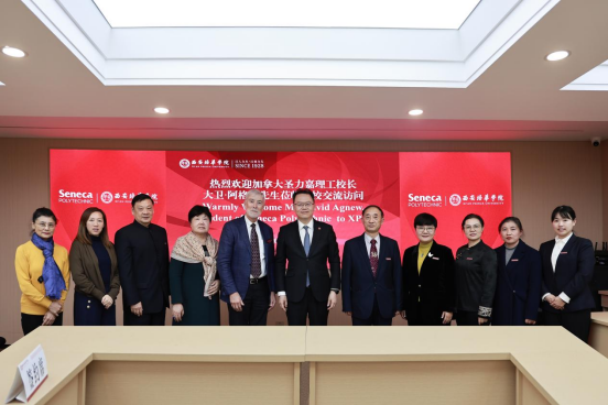 On December 11th, President David Agnew and his delegation from Seneca Polytechnic arrived at our university for an exchange visit. President David Agnew of Seneca Polytechnic, Agent of Seneca Polytechnic Yang Lan, Director, Regional Business Development, East and Southeast Asia of Seneca Polytechnic Nick Huang, Business Development Manager— the Greater China Maggie Chen,alongwith Chairman of the Board ofXPHUJiang Bo, International President of XPHU Richard Li-Hua, Director of the International Exchange CenterGraceWang , Executive ViceDean of the School of Media and Design Xu Ying, ViceDean of the Medical School Bie Beibei, and Director of the Preschool Education Department of the Humanities and International EducationSchool Wang Lulu engaged in a discussion and exchange, and held a signing ceremony as well as a Appointment Ceremony of Honorary Professor.