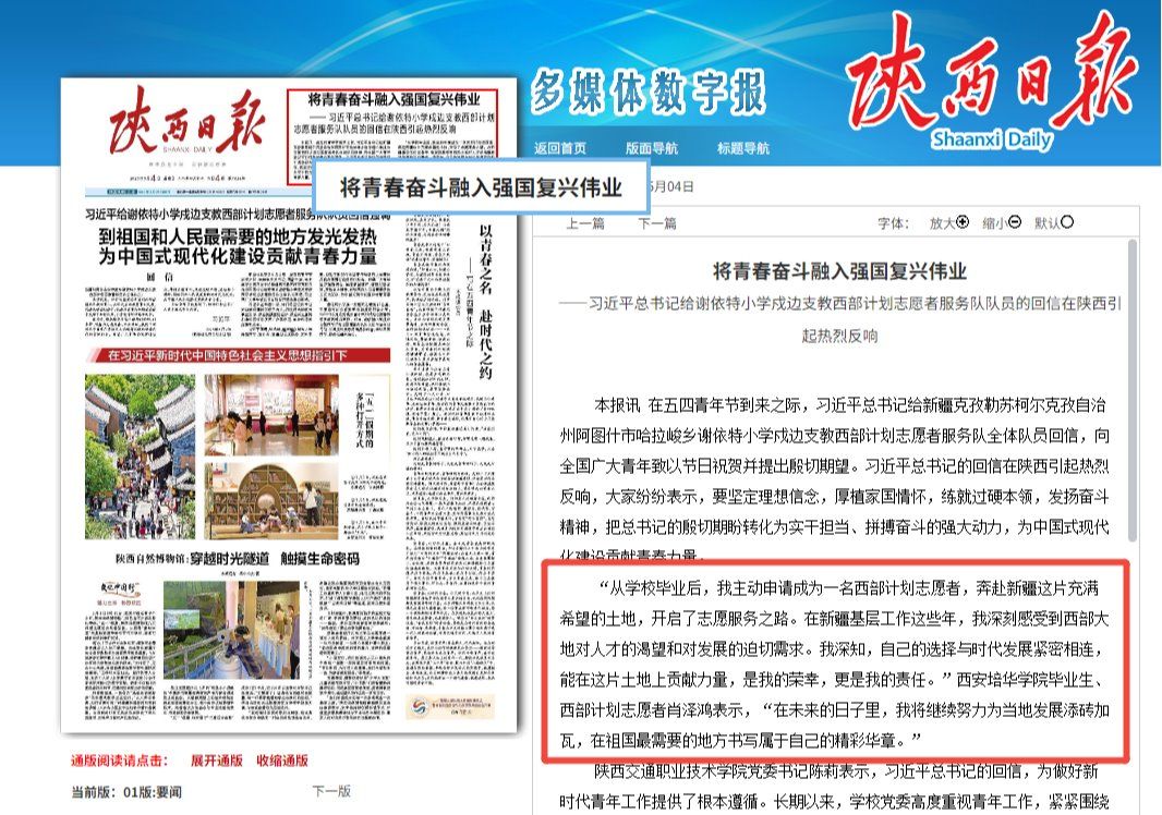 在五四青年节到来之际,习近平总书记给新疆克孜勒苏柯尔克孜自治州阿图什市哈拉峻乡谢依特小学戍边支教西部计划志愿者服务队全体队员回信,向全国广大青年致以节日祝贺并提出殷切期望。习近平总书记的回信在陕西引起热烈反响,大家纷纷表示,要坚定理想信念,厚植家国情怀,练就过硬本领,发扬奋斗精神,把总书记的殷切期盼转化为实干担当、拼搏奋斗的强大动力,为中国式现代化建设贡献青春力量。“从学校毕业后,我主动申请成...