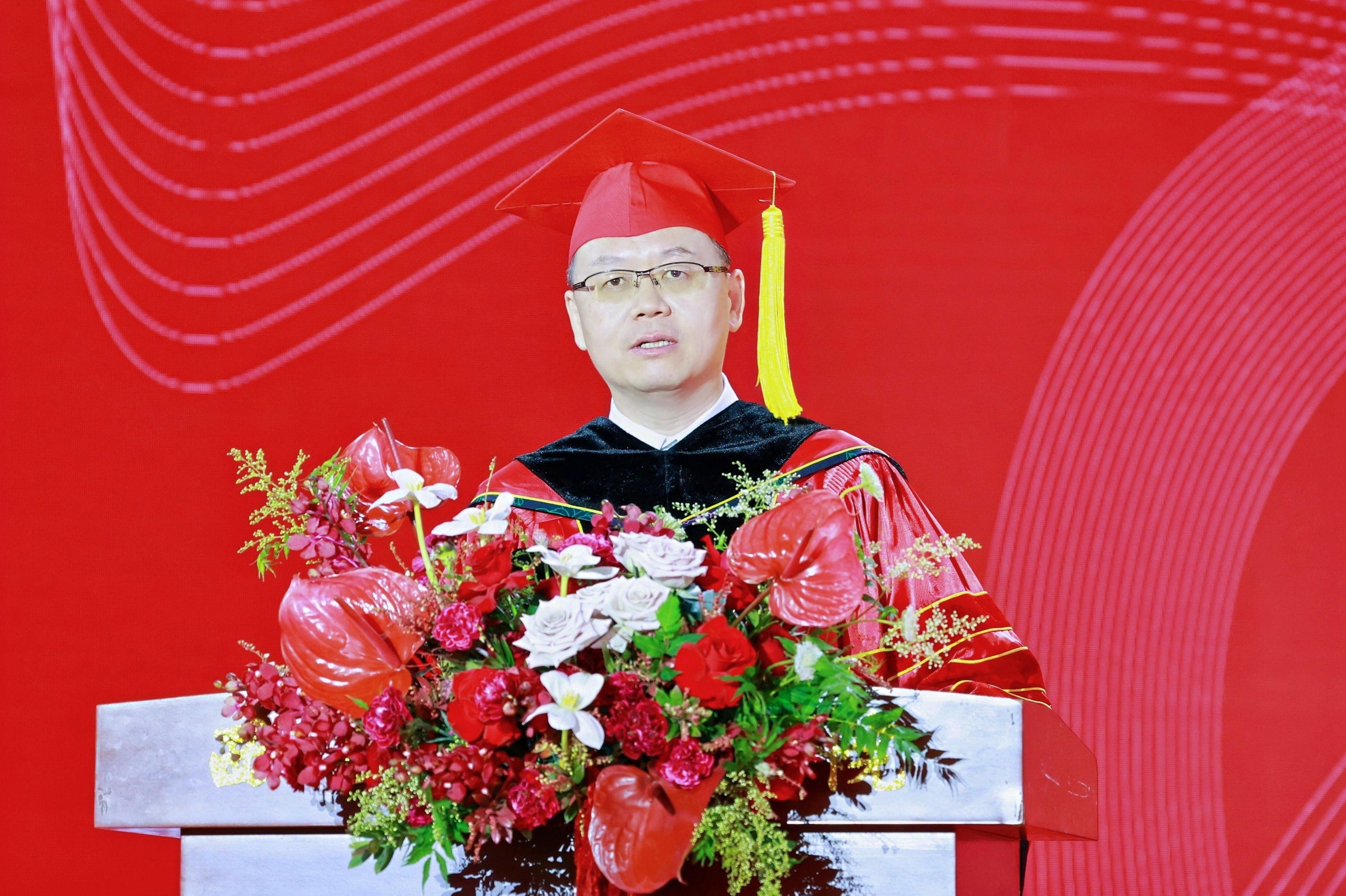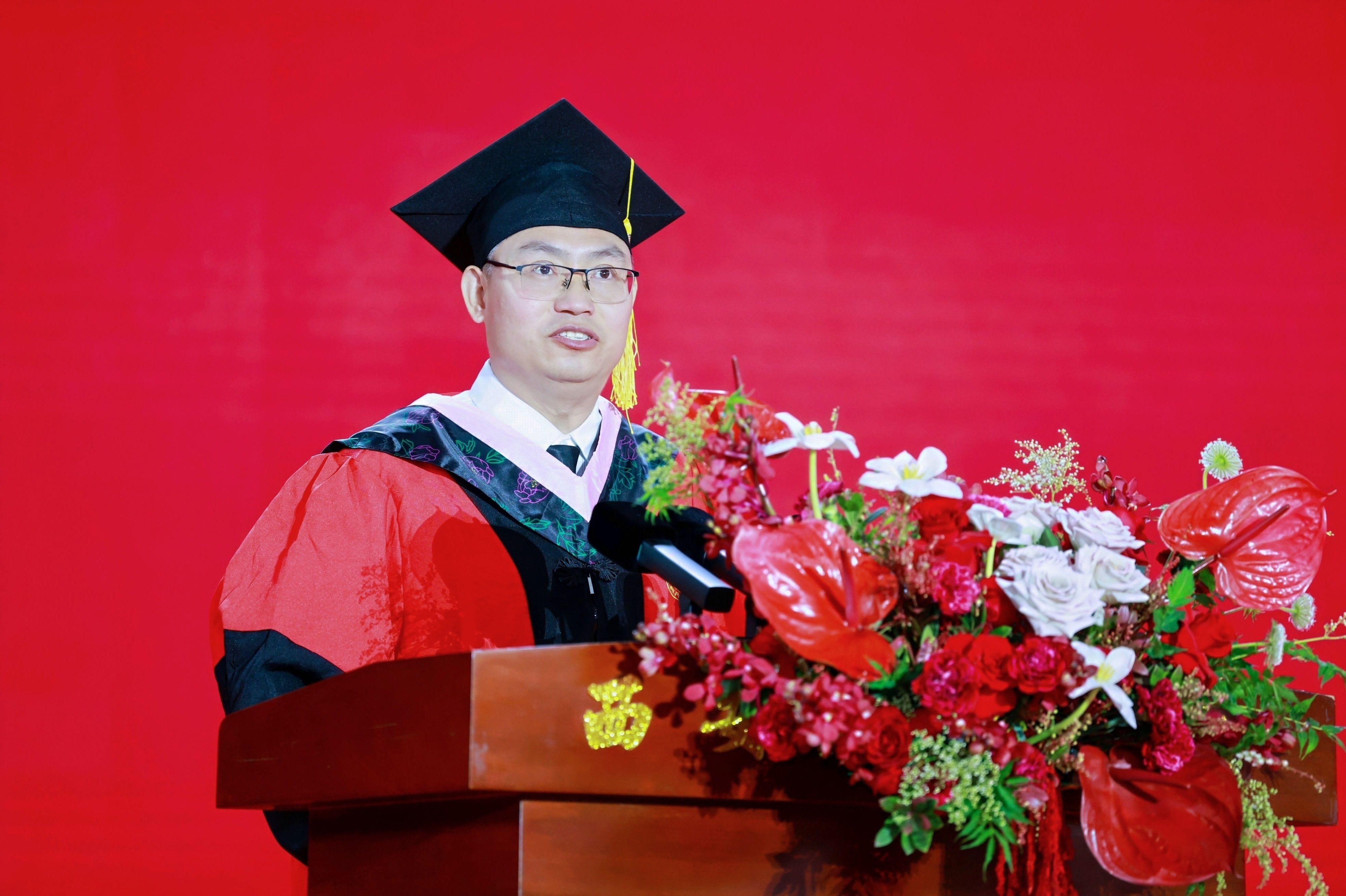 人文与国际教育学院副院长栾博强作为教师代表发言,他以“三个培华记忆”带领全体毕业生重温大学生活,并表示培华不仅传授知识,更赋予“博学、审问、笃行”的成长密码,塑造了学子们“立己达人”的培华风骨。他希望毕业生们要做一粒“向下扎根的种子”,做一座“融通古今的桥梁”,做一束“照亮他人的光源”。他号召大家勇担“强国有我,功成有我”的时代使命。